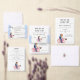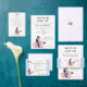 Celebra el amor sobre las ruedas con esta invitación romántica a la participación que incluye un ilustracion acuarela de una pareja en una bicicleta rosa. Este diseño moderno e informal es perfecto para fiestas de compromiso al aire libre o de estilo rural. Personalizar el texto con tus nombres, fecha, hora e información de RSVP. Ideal para los que buscan una invitación fresca y sentida con un toque de fantasía.