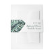 El envoltorio de la banda de la panza de la invitación tropical con una sola hoja de palma grande de monstera en la parte delantera y la tipografía moderna, diseñada para un boda o fiesta único de destino de playa.