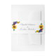 El diseño presenta elegantes girasoles, rosas y flores silvestres con una paleta de colores dorados amarillo, burdeos y azul. Puede cambiar el color de fondo en la parte delantera y de vuelta al color de su elección o dejar ambos en blanco.
