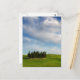 Postal vertical de un grupo de cipreses en un paisaje con colinas verdes y flores amarillas bajo hermosas nubes blancas cerca de Torrenieri en el Val d'Orcia (valle de Orcia) en Toscana, Italia.