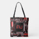 Diseño moderno con el cierre de un tablero de circuitos informáticos en rojo, negro y blanco. Bolsa con un diseño de personalizable para que puedas personalizar con tu propio texto, imágenes e ideas. Creado usando una fotografía original y técnicas digitales de Jess Perry.