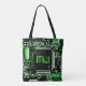 Diseño moderno con el cierre de un tablero de circuitos informáticos en verde, negro y blanco. Bolsa con un diseño de personalizable para que puedas personalizar con tu propio texto, imágenes e ideas. Creado usando una fotografía original y técnicas digitales de Jess Perry.