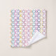 Este conjunto de toallas tiene un diseño Art Déco de círculos naranja, turquesa, rosa, azul, violeta y amarillo que se conectan con líneas en un campo blanco.
