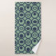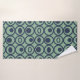 Este juego de toallas incluye un lavabo verde claro, una toalla de mano azul y una toalla de baño con un diseño geométrico de círculos en filas con círculos u óvalos dentro de azul sobre un campo de verde.