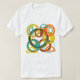 Esta camiseta tiene un diseño moderno de mediados de siglo de círculos y semicírculos en naranja, amarillo, verde, marrón y turquesa sobre un campo de blanco. Si quieres el mismo diseño con colores diferentes, envíame un mensaje.