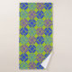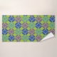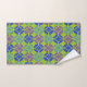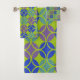 Este conjunto de toallas tiene un diseño moderno de mediados de siglo de círculos abiertos sobre círculos cerrados en azul, verde y morado sobre un campo de verde.