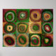 Resumen de pintura digital en muchos matices de verde con amarillo y marrón, círculos dentro de cuadrados. Hecho en Photoshop.