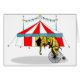 Circus Elephant montando una bicicleta con una carpa de circo rojo y blanco