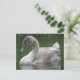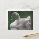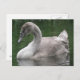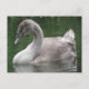 Esta postal muestra una fotografía de un hermoso cisne. El cisne es un ave juvenil, se nota por las plumas grises en la cabeza y la falta de un pico naranja. El cisne está deslizándose con gracia a través del agua en un lago tranquilo.