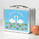 Esta impresionante lonchbox presenta una imagen de arte digital de un par de hermosos cisnes blancos con golpes de naranja enfrentándose unos a otros que parecen estar besándose. Debajo de los cisnes hay un grupo de flores de nenúfares de agua rosa bonito con centros amarillos y toallas de lirio verde. Un bonito diseño boda. Hay texto personalizado para que puedas incluir los nombres de la pareja feliz.