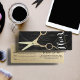 Tarjeta de cita para el Hair Salon Business - Elegantes tijeras de oro Faux sobre fondo de patrón de pelo blanco y negro. Elegante salón de peluquería negro y dorado para la cita tarjetas de visita con un par de tijeras de oro falsas Personaliza ingresando la información del peluquero profesional o peluquero.