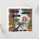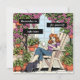 Un divertido ilustracion de historietas de una mujer sentada en su silla de césped en su patio, con su gato, una taza de café o té y rodeada de clematis morados y plantas colgantes.