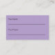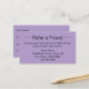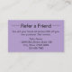 Esta tarjeta de referencia púrpura pálida tiene una plantilla de texto que puede editar para promocionar su negocio. Como se muestra, dice Refiera a un Amigo en el frente. Luego hay un texto que muestra los términos de tu oferta, tu nombre de negocio, dirección y número de teléfono. La parte de atrás tiene líneas para que su cliente escriba su nombre y para que su amigo escriba su nombre.