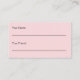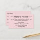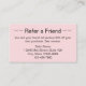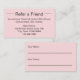 Esta tarjeta de referencia rosa pálido tiene una plantilla de texto que puede editar para promocionar su negocio. Como se muestra, dice Refiera a un Amigo en el frente. Luego hay un texto que muestra los términos de tu oferta, tu nombre de negocio, dirección y número de teléfono. La parte de atrás tiene líneas para que su cliente escriba su nombre y para que su amigo escriba su nombre.