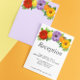 Colección de bodas con un diseño floral rojo vibrante, amarillo dorado y violeta claro acentuado con cítricos naranja y limón y vegetación botánica