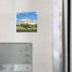 Imán fotográfico de recuerdo de un paisaje en Puglia, Italia, con la ciudad blanca (citta bianca) Ostuni sobre una colina sobre un huerto de olivos bajo un cielo nublado.