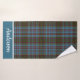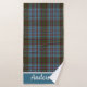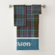 La elegante toalla de baño de yeso de enlucido envuelto en el colorido patrón de yeso tartán de Anderson. Una franja azul, en un extremo de la toalla de baño, tiene un texto personalizado blanco listo para personalizar según tus necesidades.