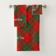 Insignia escudo Clan Cumming rodeada por una correa y hebilla sobre el fondo tartán. Texto personalizado en cada toalla.