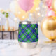 Insignia escudo del clan Douglas rodeada por una correa y hebilla sobre el fondo tartán. Texto personalizado en ambos lados.