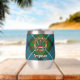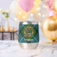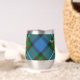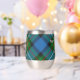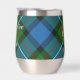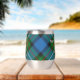 Insignia escudo del clan Ferguson rodeada por una correa y hebilla sobre el fondo del tartán. Texto personalizado en ambos lados.