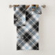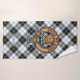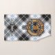 Insignia escudo del Clan Forbes rodeada de una correa y hebilla sobre un fondo escocés. Texto personalizado en cada toalla.
