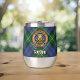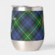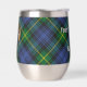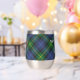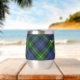 Insignia escudo del clan Gordon rodeada por una correa y hebilla sobre fondo tartán. Texto personalizado en ambos lados.