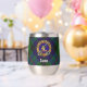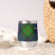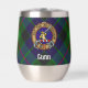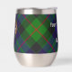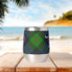 Insignia de clan Gunn escudo rodeada por una correa y hebilla sobre el fondo tartán. Texto personalizado en ambos lados.