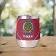 Insignia escudo del clan Hamilton rodeada de una correa y hebilla sobre un fondo blanco rojo. Texto personalizado en ambos lados.