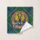 Insignia escudo Clan Johnston rodeada de una correa y hebilla sobre el fondo del tartán. Texto personalizado en cada toalla.