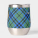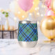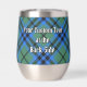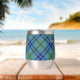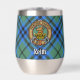 Insignia escudo del clan Keith rodeada por una correa y hebilla sobre fondo tartán. Texto personalizado en ambos lados.