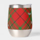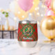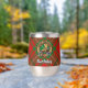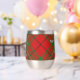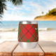 Insignia escudo del clan MacAulay rodeada por una correa y hebilla sobre el fondo del tartán. Texto personalizado en ambos lados.
