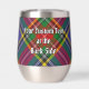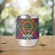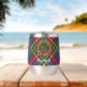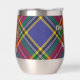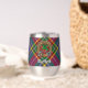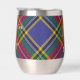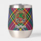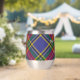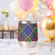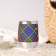 Insignia escudo del clan MacBeth rodeada por una correa y hebilla sobre fondo tartán. Texto personalizado en ambos lados.