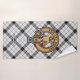 Insignia de escudo del clan MacFarlane rodeada por una correa y hebilla sobre fondo blanco y negro tartán. Texto personalizado en cada toalla.