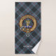 Insignia escudo del clan MacKay rodeada por una correa y hebilla sobre fondo azul tartán. Texto personalizado en cada toalla.