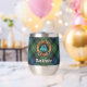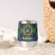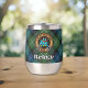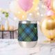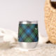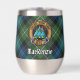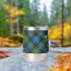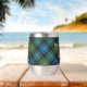 Insignia escudo del clan MacKenzie rodeada por una correa y hebilla sobre fondo tartán. Texto personalizado en ambos lados.