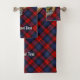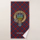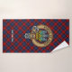 Insignia escudo del clan MacLachlan rodeada por una correa y hebilla sobre el fondo tartán. Texto personalizado en cada toalla.