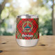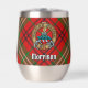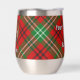 Insignia escudo del clan Morrison rodeada por una correa y hebilla sobre fondo escocés rojo. Texto personalizado en ambos lados.