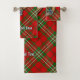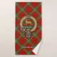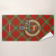 Insignia escudo del clan Scott rodeada por una correa y hebilla sobre fondo de tartán rojo. Texto personalizado en cada toalla.