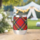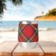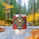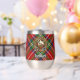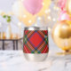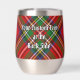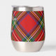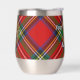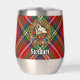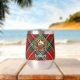 Insignia escudo del clan Stewart rodeada por una correa y hebilla sobre el fondo del trartán real. Texto personalizado en ambos lados.