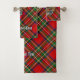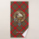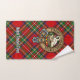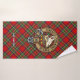 Insignia escudo del clan Stewart rodeada por una correa y hebilla sobre el fondo del trartán real. Texto personalizado en cada toalla.