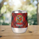 Insignia escudo Clan Wallace rodeada por una correa y hebilla sobre el fondo tartán. Texto personalizado en ambos lados.