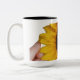 Una taza de cerámica con un diseño alegre. El texto "imágenes de flor de sol" está escrito en una variedad de colores brillantes, con algunas letras juguetonamente superpuestas otras. Se pueden imaginar ilustraciones de girasol coloridos acompañando el texto, pero no hay imágenes reales en la taza misma.