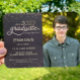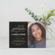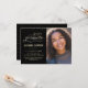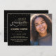 Esta elegante y festiva invitación a la fiesta de graduación fotográfica de 4.5" x 6.25" muestra un confeti dorado (Relieve metalizado simulado) con las palabras "Graduado de clase 2023" mostrando en una fuente de escritura dorada. Hay un área de fotos personalizado para tu foto del graduado. El fondo es negro, pero puede cambiarse a cualquier color que elija. Los detalles de la celebración se pueden personalizar fácilmente para su evento especial (como el nombre de la escuela secundaria). La parte posterior de la tarjeta presenta un patrón de puntos dorados, también con un fondo negro que puede ser personalizar a su gusto. Una forma bonita y sencilla de invitar a los invitados a celebrar una graduación.