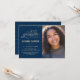 Esta elegante y festiva invitación a la fiesta de graduación fotográfica de 4.5" x 6.25" presenta un confeti dorado (Relieve metalizado simulado) con las palabras "Graduado de clase 2025" mostrando en una fuente de escritura dorada. Hay un área de fotos personalizado para tu foto del graduado. El fondo es azul, pero se puede cambiar a cualquier color que se elija. Los detalles de la celebración se pueden personalizar fácilmente para su evento especial (como el nombre de la escuela secundaria). La parte posterior de la tarjeta tiene un patrón de puntos dorados, también con un fondo azul que puede personalizar a su gusto. Una forma bonita y sencilla de invitar a los invitados a celebrar una graduación.