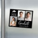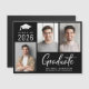 Tarjeta de invitación magnética de la clase moderna de 2025 para la graduación negra con 3 fotos y "Graduado" en un guión blanco en negrita contemporáneo. Añada el nombre del graduado, el año de clase y la escuela secundaria o la universidad en simple tipografía blanca.