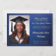 Esta tarjeta de invitación de graduación incluye una foto del personalizable. La tarjeta tiene un diseño elegante azul y dorado con texto de escritura decorativa que anuncia la graduación para un graduado de la Clase 2025. También incluye un área de personalizable para los nombres de los padres, la futura universidad del graduado y una foto en la parte de atrás. La disposición es formal y festiva, perfecta para compartir un orgulloso hito con la familia y amigos.