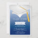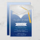 Clase moderna de la invitación a la fiesta de graduación 2014 con una gorra blanca de grado y una pancarta blanca colocada en un oscuro fondo azul marino para una graduación de secundaria o universitaria para un niño o chica. Visite nuestra tienda para ver una variedad de temas populares de moda en la escuela.