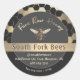 La banda Gold Gradient Band a través de la etiqueta muestra tu nombre apiario en esta etiqueta color marrón oscuro/taupe con un patrón iridiscente de honeycomb y ilustracion vintage de abejas reina.