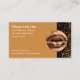 Elegantes tarjetas de negocios con temas de belleza y maquillaje diseñadas con un lujoso emblema de lápiz labial dorado y gráfico de confeti decorativo a color. Una tarjeta de visita de moda para un artista de maquillaje, cosméticos o esteticista, o representante de ventas de cosméticos. Entrega tus tarjetas de visita con estilo.