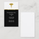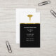 Clásicas tarjetas de negocios de seguros médicos en un diseño de gama alta presentado en formato vertical sobre estilo de tarjeta visitante glososa de alta calidad con el símbolo del sistema de salud de tono dorado caduceus. Diseñado para un representante de seguros, enfermera registrada, enfermera de salud domiciliaria o farmacia.